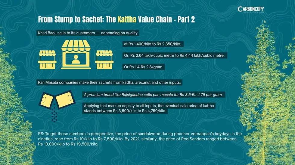 By this logic, the eventual sale price of kattha is ₹3,500/kilo to ₹4,750/kilo. In other words, the final value of a cubic metre of Khair ranges between ₹6.61 lakh and ₹8.97 lakh. CarbonCopy has run these calculations past IFS officers in UP and Uttarakhand.